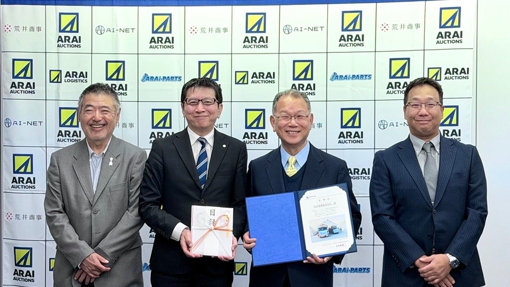 (左から)国連WFP協会 エキスペリエンツ・ボランティア 安藤公秀 様、同 事務局長 青木創 様、荒井商事 代表取締役社長 荒井亮三、同 上級執行役員 オークション・カンパニー長 尾籠厚