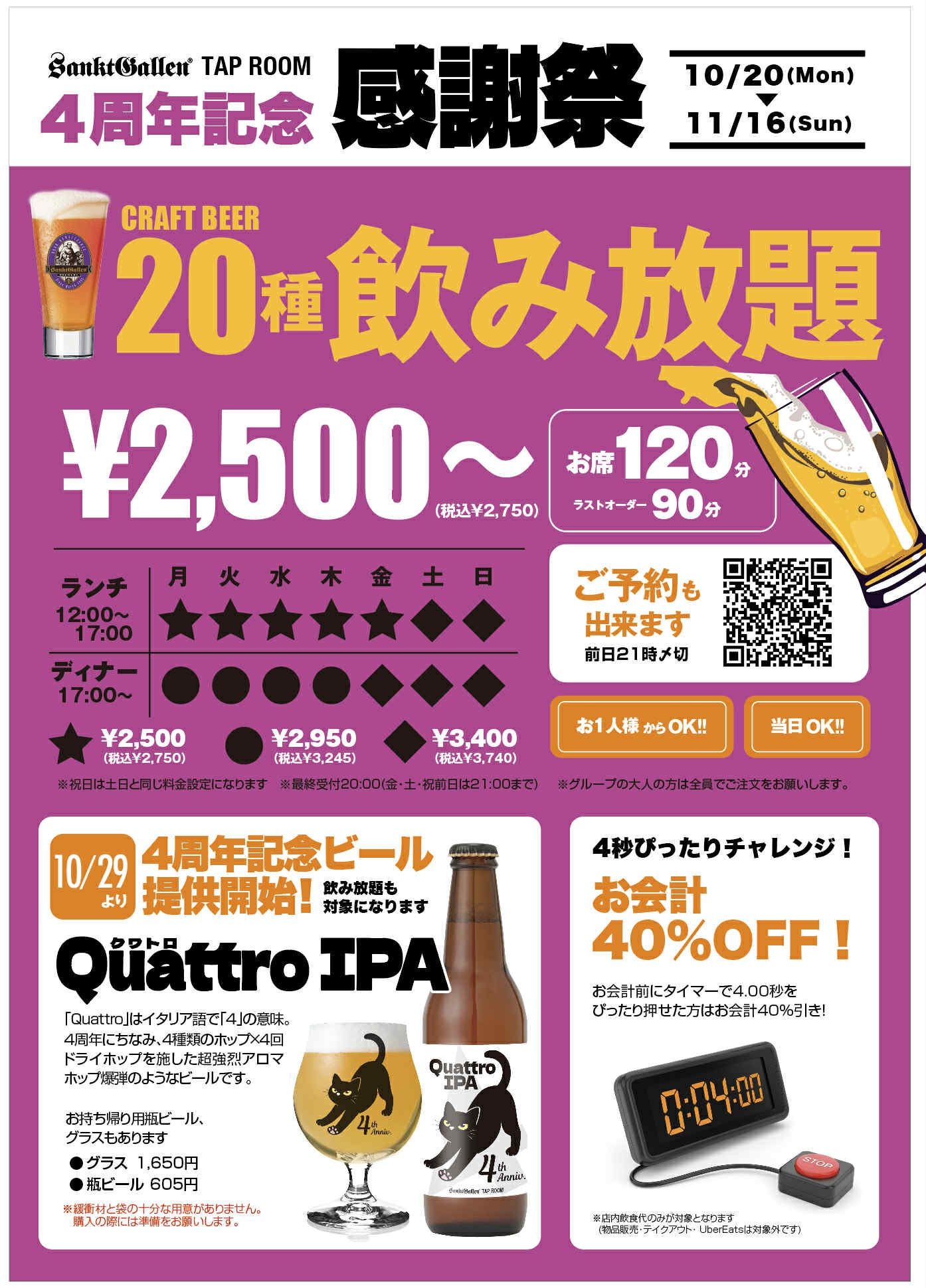 4周年の感謝を込め、タップルームではお得な飲み放題プランを実施中。