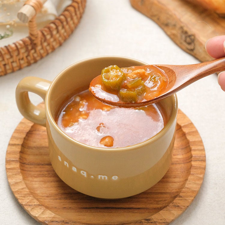株式会社スナックミー(本社:東京都中央区 / 代表取締役:服部慎太郎)は、2025年10月23日(木)より、国産の鶏肉とオクラで丁寧に煮込んだ「ガンボスープ」と、スナックミーオリジナルのスタッキングマグをセットにした冬季限定商品を、スナックミーオンラインストアにて販売開始いたしました。とろっと濃厚で素材の旨みが詰まったスープを、スナックミーのデザイナーによるオリジナルマグとともにお楽しみいただけます。