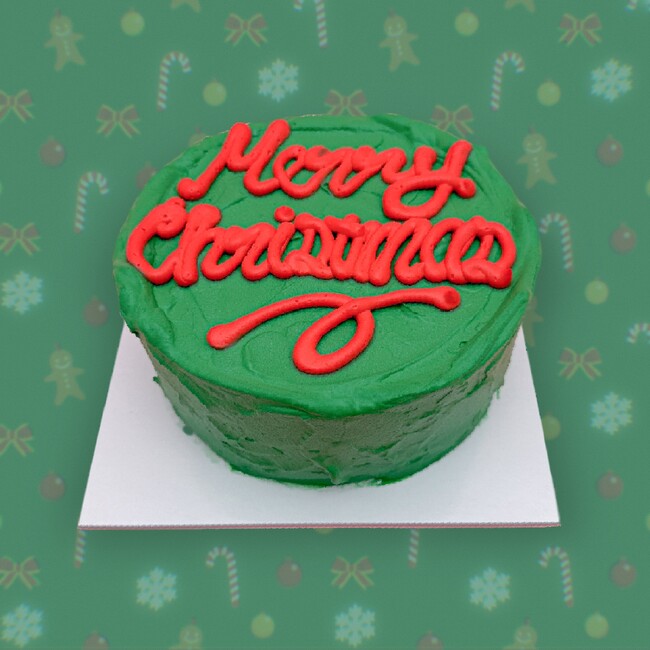 深い緑のケーキに60sのアメリカンでレトロなイメージを伝えるため、ヴィンテージ風のフォントで真っ赤な「Merry Christmas」のメッセージを描きました。中のお味は定番のイチゴのショートケーキです。