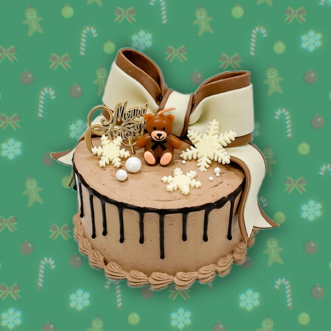 大きなリボンのチョコレート飾りとテディベアのキャンドルが乗ったチョコレートケーキ。雪の結晶や白いパール飾りなどでクリスマスの気分を盛り上げます。全体をブラウンカラーで統一したところがポイントです。