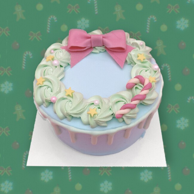 毎年人気のリースケーキをfancyデザインでリニューアル。白とピンクのパールに星、キャンディケインを乗せてパステルカラーでまとめたゆめかわクリスマスショートケーキです。