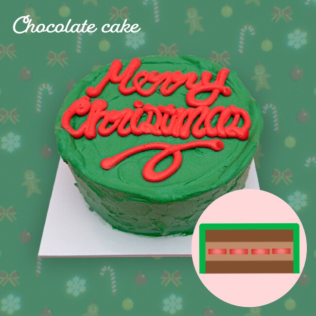深い緑のケーキに60sのアメリカンでレトロなイメージを伝えるため、ヴィンテージ風のフォントで真っ赤な「Merry Christmas」のメッセージを描きました。中のお味はココアスポンジにチョコレートクリーム、いちごのチョコレートケーキです。