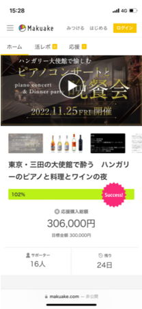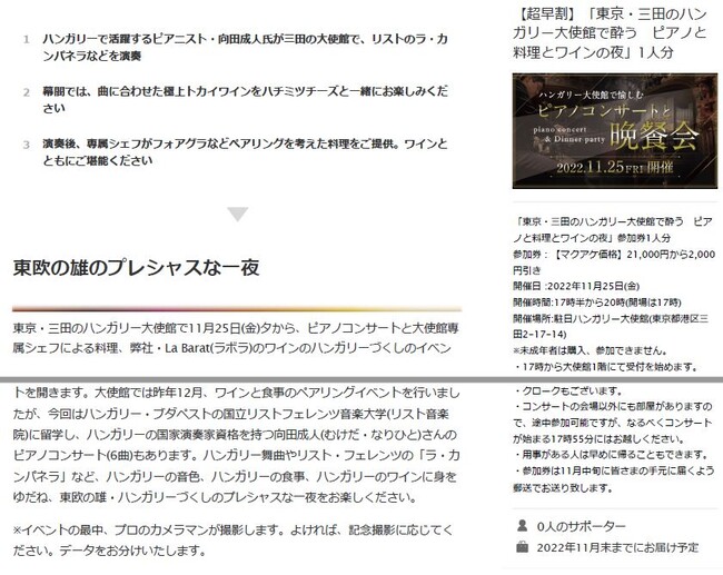 ピアノと料理とワインのハンガリーづくしというのに魅力を感じていただけた方が多いようで、開始から2時間で16人にご購入いただけました。