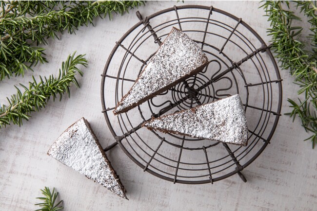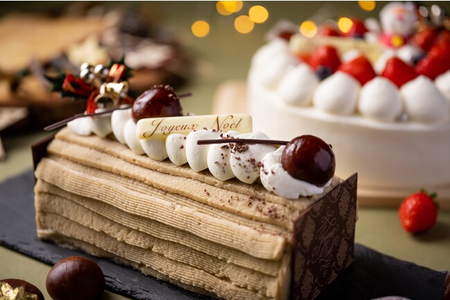 冬のある日、切り株の上の雪が薄っすら積もった様子をイメージした「森のごちそう マロンのブッシュドノエル」は大町産ブルーベリーの甘酸っぱいマルムラードがアクセント。アーモンドパウダーと信州の名産くるみが入ったダックワーズに、栗入りホワイトチョコレートムースがたっぷり。和栗のマロンクリームで仕上げ、渋皮煮をのせました。
