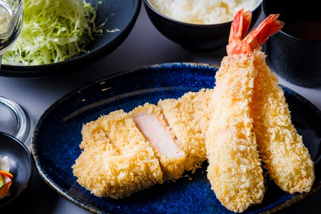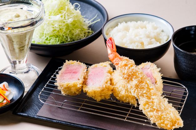 粉雪衣のとんかつにたっぷりとタルタルソースをかけて楽しむ海老フライがセットになった御膳