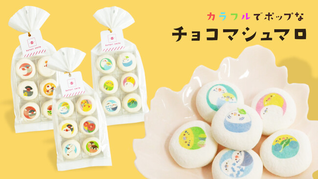 チョコマシュマロ(6粒入り)は、セキセイインコ・オカメインコ・文鳥・コザクラインコ・シマエナガ・スズメの絵柄の「ことりミックス」、セキセイインコだけがデザインされた「なごみセキセイ」、文鳥だけがデザインされた「なごみ文鳥」の、計3種を発売いたしました。