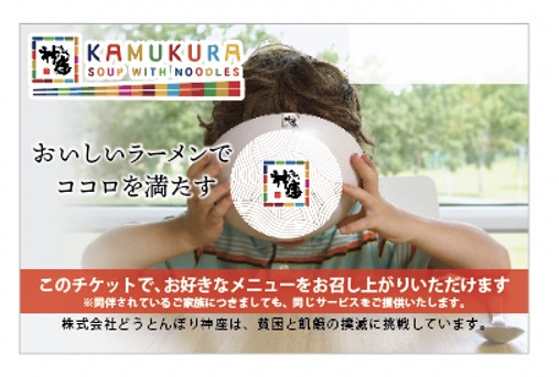 そこで、夏休みに貧困家庭に向けて食糧提供をしている認定NPO法人キッズドアに協賛をし、こども達に家族と一緒に外食を楽しむ機会を持ってもらうべく、どうとんぼり神座のラーメンを無料で食べられる「SDGsラーメンチケット」の配布を行いました。チケット配布は今回が初となりますが、多くの方からのお喜びの声を受け、食糧支援の重要性を改めて認識いたしました。神座は今後も日本の貧困・飢餓問題に寄与してまいります。