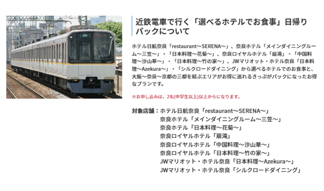 ホテル日航奈良「restaurant~SERENA~」、奈良ホテル「メインダイニングルーム~三笠~」・「日本料理~花菊~」、奈良ロイヤルホテル「扇滝」・「中国料理~沙山華~」・「日本料理~竹の家~」、JWマリオット・ホテル奈良「日本料理~Azekura~」・「シルクロードダイニング」から選べるホテルでのお食事と、大阪~奈良~京都の三都を結ぶエリアがお得に巡れるきっぷがパックになったお得なプランです。※お申し込みは、2名(中学生以上)以上からになります。