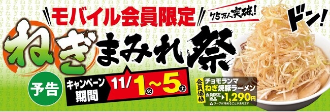 キャンペーン内容:通常の「ねぎ焼豚ラーメン」の約3倍のねぎと、焼豚13枚をトッピングしたボリューム満点の新メニュー『チョモランマねぎ焼豚ラーメン』(1,290円税込)を期間限定で提供。また既存のねぎメニューや11月から新たにグランドメニューとなる「ねぎ塩炙り焼豚ご飯」と「ねぎラーメン」のセット、「瓶ビール」と「ねぎ皿」のセットなど、それぞれ150円~最大350円も割引になる会員特別クーポンも発行し、ねぎメニューがお得になります。