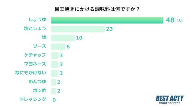 目玉焼きにかける調味料について100人にアンケートを行ったところ、「しょうゆ」と回答する人が最も多い結果となりました。