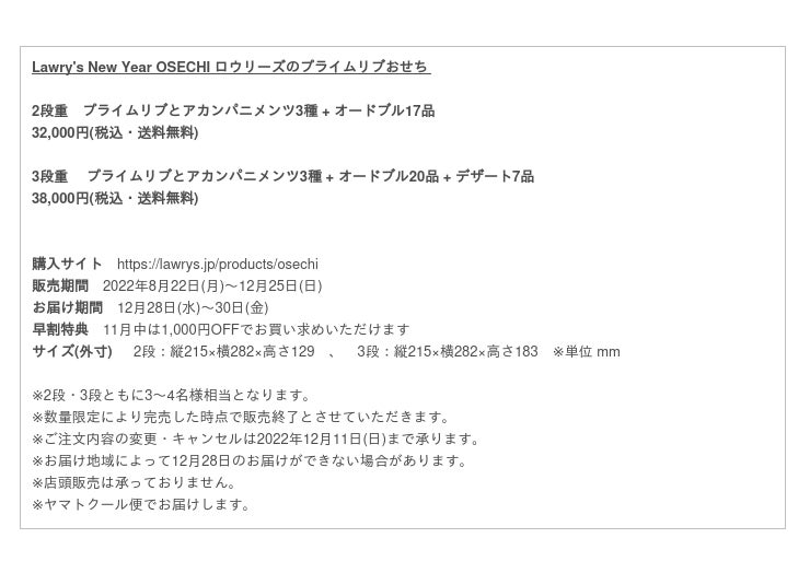 株式会社ワンダーテーブル[本社:東京都新宿区西新宿/代表取締役社長 秋元 巳智雄]では、2022年8月22日(月)より、アメリカンローストビーフ専門店「ロウリーズ・ザ・プライムリブ(以下、ロウリーズ)」による、全国配送可能な通販おせち『Lawry's New Year OSECHI(ロウリーズのプライムリブおせち)』をオンラインで販売しています。昨年の実績を踏まえ、発売前から緻密なネット戦略を立てたことにより、初日から1週間で200セットを受注し、好調な滑り出しを切っていることをお知らせします。