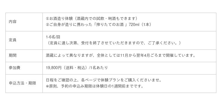 実際には各酒蔵毎に少しずつ異なりますので、詳細は各酒蔵のページをご覧ください。