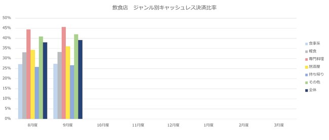 今月からジャンル別のキャッシュレス決済比率の月次推移を見ていく。8月度→9月度で全ジャンル平均で103%と微増。比較的伸びているのは専門料理・居酒屋である。