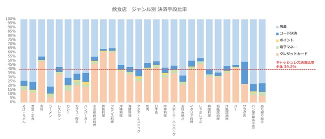 集計内容:飲食店 ジャンル別 キャッシュレス決済方法比率、キャッシュレス決済比率(内訳)