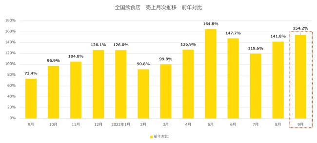 l9月度の前年対比の売り上げ伸長率は、前月から12.4ポイント良化し、前年対比で154.2%を示している。2021年9月の売り上げが2020年比73.4%、2020年9月の売り上げが2019年比106.8%(※グラフ表示外)なので、コロナ前(2019年)対比では130%の水準である。