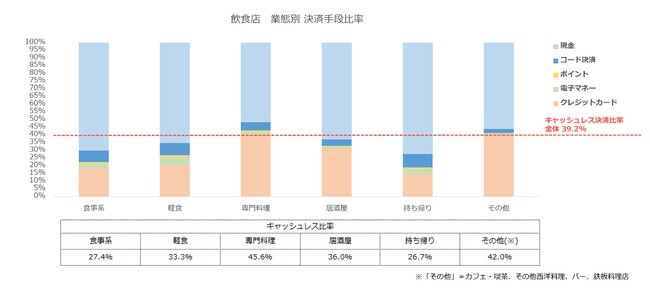 業態別に見ると、専門料理・その他でのキャッシュレス決済比率が高い。コード決済・電子マネーの使用比率は食事・軽食系・持ち帰り業態で高い。