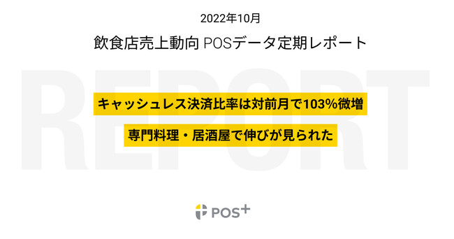 クラウド型モバイルPOSレジの「POS+(ポスタス)」を提供するポスタス株式会社(本社:東京都中央区、代表取締役社長:本田 興一)は、2022年9月度の飲食店売上動向についてPOSデータを基に集計し、結果をとりまとめましたのでお知らせします。 また、今回から新たな取り組みとして、全国各業態において導入が進むキャッシュレス決済に注目し、ジャンル別のキャッシュレス決済比率の月次推移の集計を開始いたしました。飲食店がどのようにこのコロナ禍の転換期を乗り越えていくのか、数値やグラフ化することで、飲食店の力を可視化し、様々な切り口でレポートしてまいります。 POSデータの集計結果に関して、購読をご希望の方は以下よりお申し込みください。https://www.postas.co.jp/data/inquiry/今後もPOS+(ポスタス)は、飲食店を取り巻く環境変化や実態に関する情報を積極的に発信し、支援策の検討と提案を行うことで、当サービスのビジョン“おもてなしのお手伝いで、はたらく、を笑顔でみたす。”の実現を目指してまいります。