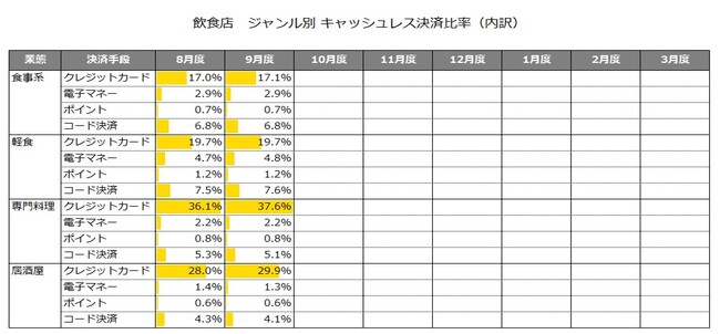 8月度→9月度でキャッシュレス決済が比較的伸びている専門料理・居酒屋では、クレジットカード比率が伸びている。