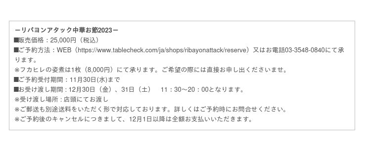 株式会社バルニバービ(本社:大阪市西区、代表取締役会長:佐藤裕久)が運営する四川チャイニーズレストラン「リバヨンアタック」(所在地:東京都中央区日本橋室町3-4-4 OVOL日本橋ビル地下1階 )では、「リバヨンアタック中華お節2023」を30セット限定で事前予約販売しております。
