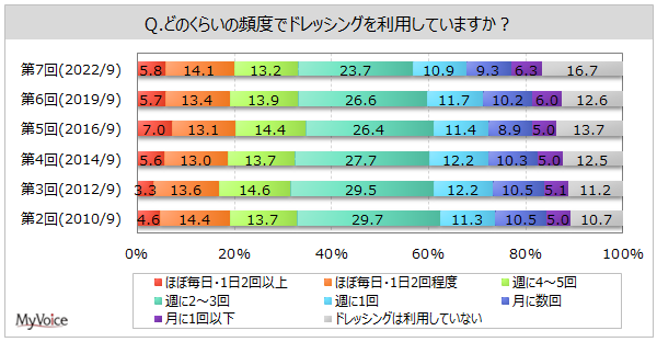 ドレッシングの利用者は8割強、「週に2~3回」がボリュームゾーンです。週1回以上の利用者は7割弱、毎日利用する人は2割となっています。