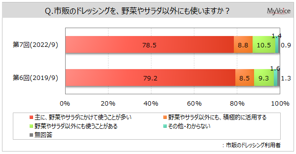 市販のドレッシング利用者のうち、ドレッシングを野菜やサラダ以外にも使う人は、「積極的に活用する」「使うことがある」を合わせて2割弱となっています。「主に、野菜やサラダにかけて使うことが多い」が78.5%です。