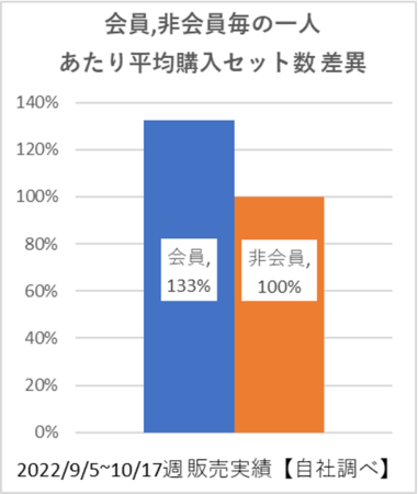 本年9月5日週~10月17日週の販売実績を調べると、同期間内の一人当たり平均購入セット数では会員のお客様は非会員のお客様より30%以上多い結果となりました。利用金額に応じてポイントで還元できるため、会員数だけでなく、利用傾向として早くも結果にあらわれています。