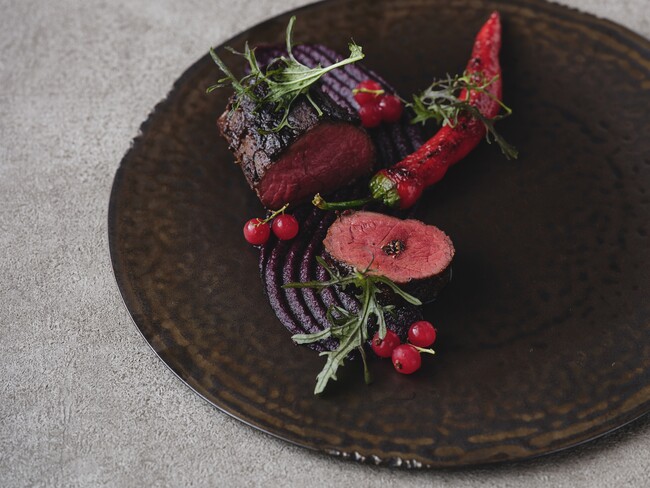 味噌とヘーゼルナッツでコクをプラスした鹿肉のロースト、紫人参のピューレを添えた一品。胡椒の風味とグロゼイユの酸味が効いたグランヴヌールソースが素材の味を引き立てます。