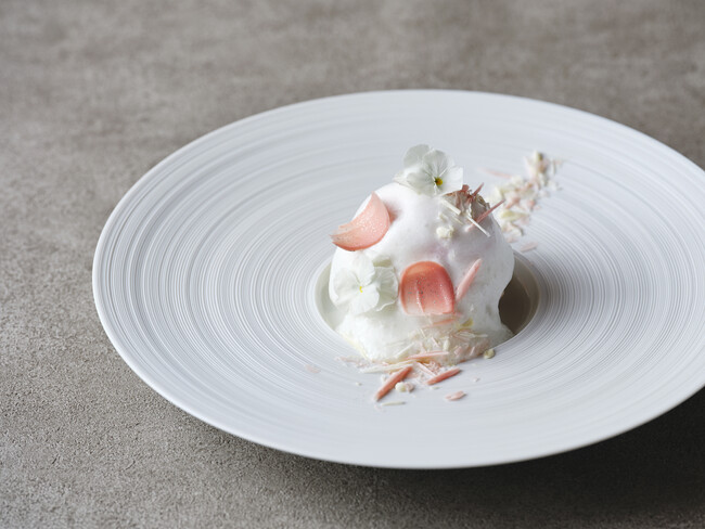 フランス産「マラデボア」苺のアイスクリ ームに、ミルクチョコレートと紅茶のクリ ームを重ね、上からカモミールとフロマー ジュブランのエスプーマをかけた冬らしい デザート。