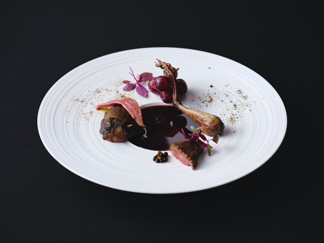 フランス産仔鳩を、ムネ肉はローストにし、モモ肉はコ ンフィに仕立てた一皿。スモークした葡萄と山椒の香る 赤ワインソースでお楽しみください。