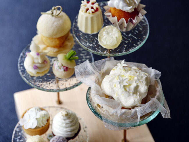 白鳥をあしらったカップケーキやスノードーム型に仕立てた金木犀 のジュレとババロアほか、檸檬と生姜の風味香るババに自家製の わらび餅をのせ、蜂蜜のクレームシャンティを重ねた定番の一品など、 繊細に仕立てられたホワイトカラーのスイーツがティースタンドを煌びやかに彩ります。セイボリーには、帆立貝や百合根、蕪やズワイ蟹といった季節の味覚をふんだんに取り入れました。ホテル敷地内の 自社農園でとれたハーブを使ったフレッシュハーブティーを含む オリジナルティーセレクションとともに、ゆったりとした午後の ティータイムをお過ごしください。
