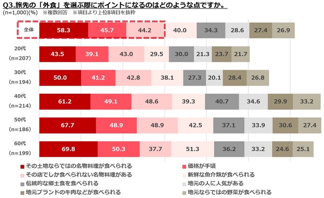 ・旅先の「外食」を選ぶ際のポイントは「その土地ならではの名物料理が食べられる」「価格が手頃」「その店でしか食べられない名物料理がある」が上位にランクイン。