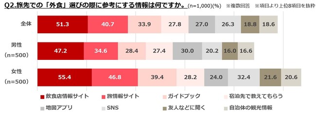 ・旅先での「外食」選びの際に参考にするのは、「飲食店情報サイト」「旅情報サイト」「ガイドブック」がTOP3。