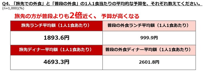 ・「旅先での外食」と「普段の外食」の1人1食当たりの平均予算は、旅先の方が普段の食事よりも2倍近く高くなる傾向。