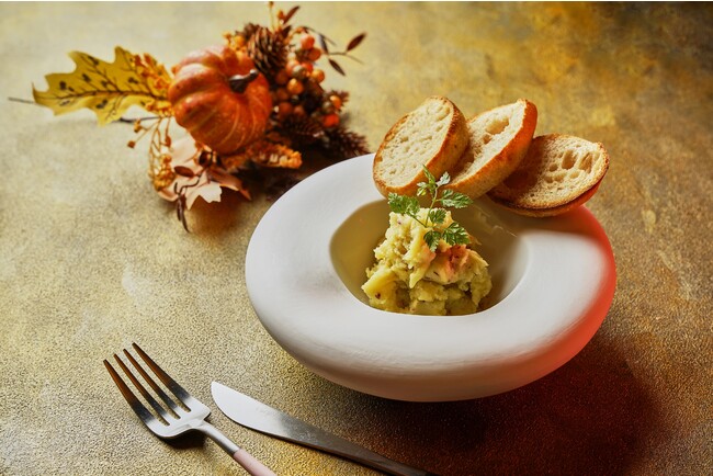 さつまいもをマッシュし、なめらかな舌触りに仕上げました。付け合わせのフランスパンにたっぷりつけてお召し上がりください。