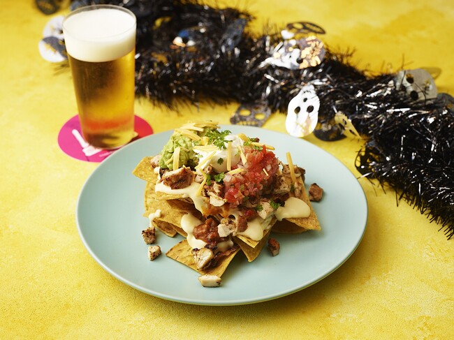 チーズソース・サワークリーム・ワカモレ・サルサをトッピングしたおつまみ。友人や家族とのシェアに最適です。