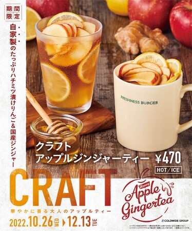 コロワイドグループの株式会社フレッシュネス(代表取締役社長:齋藤 健太朗/本社:神奈川県横浜市西区)は、2022年10月26日(水)より、ハンバーガーチェーン「フレッシュネスバーガー」にて、店内仕込みの生フルーツそのものの美味しさを楽しむ事が出来る「クラフトアップルジンジャーティー」を期間限定発売いたします。