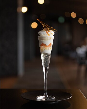 シャンパーニュ地方のシャンパンを使用したジュレに、レモンのグラニテ、クリームチーズアイスの層に、仕上げとして香り高い白トリュフをあしらった特別なパルフェです。
