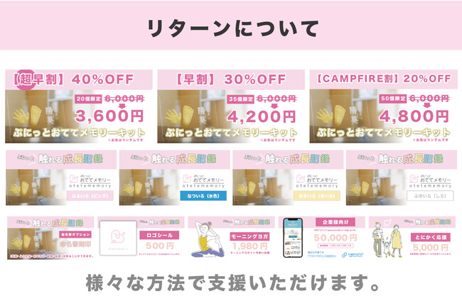 CreativePocket株式会社(東京都新宿区西新宿、代表取締役 福田慎也)は、赤ちゃんの手足の感触を残せる手形足形キット「ぷにっとおててメモリー」のクラウドファンディングをCAMPFIREにて2022年10月10日から開始し、開始5日目で目標金額の20万円を達成しました。10月19日現在(開始10日目)で総額213,200円(達成率106%)が集まっています。