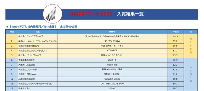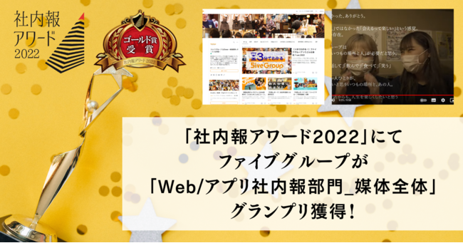 「"楽しい"でつながる世界をつくる」を経営理念とする飲食企業の株式会社ファイブグループ(本社:東京都武蔵野市 代表取締役社長:坂本憲史 以下ファイブグループ)は、ウィズワークス社内報総合研究所が主催する「社内報アワード2022」において、ゴールド賞を「Web/アプリ社内報部門_媒体全体」と「動画社内報部門」の2部門で受賞するとともに、「Web/アプリ社内報部門_媒体全体」では全49企画の頂点に立つグランプリを獲得しました。数多くの著名企業が並ぶ中、初エントリーの一昨年にはブロンズ賞、昨年にはシルバー賞を受賞しており、今年はついにゴールド賞、そしてグランプリを獲得しました。グランプリ獲得の「Web/アプリ社内報部門_媒体全体」では明確な目的設定と、1媒体を1人体制で多方面のステークホルダーにアプローチし、経営課題の解決に直結させていく設計が評価されました。