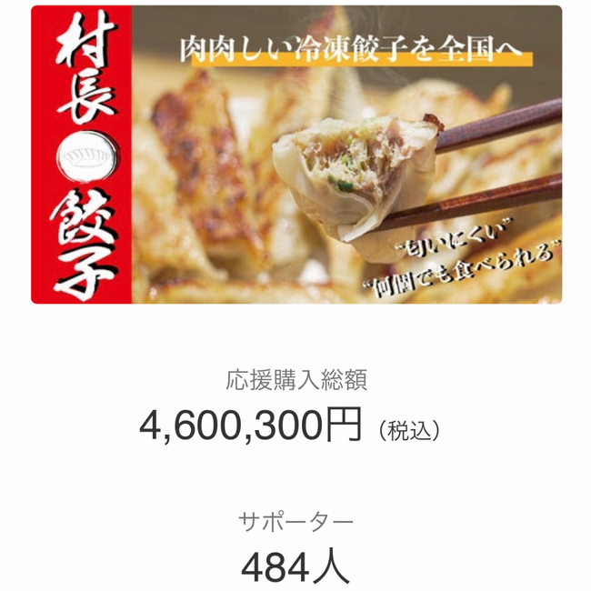 初めてのクラウドファンディングでしたが、"村長餃子"は三大プラットフォームである『Makuake』で冷凍食品部門&餃子部門において、歴代最高額の応援購入額を達成し冷凍餃子界の伝説となりました。