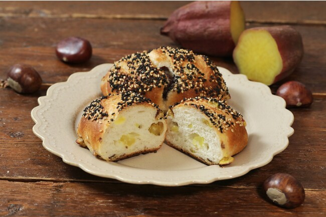 フランスパンの生地に、渋皮栗となると金時をいれて焼き上げた秋にピッタリな商品です。
