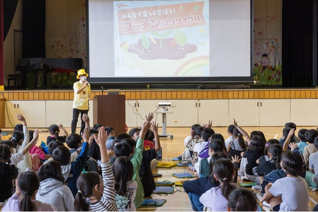 江崎グリコ株式会社は、2022年10月19日(水)に、子どもたちによって集められた「プッチンプリン」の容器が文房具になって帰ってくる「プッチンプリン オリジナル文房具贈呈式」を、流山市立新川小学校にて行いました。「プッチンプリン」の容器が文房具になるまでの仕組みを学び、実際にできた文房具で“未来のお菓子・デザート”を描いてもらうSDGs取り組みを実施しました。