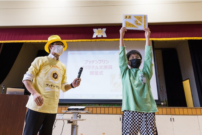 今年6月16日(木)に同校にて、植物性原料で作られた「植物生まれのプッチンプリン」の容器を通して、小学生にリサイクルの楽しさを伝える出張授業「みんなで楽しく学ぼう!プッチンプリサイクル」を行い、同商品の給食提供もしました。また出張授業以降、子どもたちは「プッチンプリン」の容器を食べ終わった後に洗い、回収BOXへ投函して約1カ月間集めてきました。そして今回、最終的にリサイクルした容器が「プッチンプリン オリジナル文房具」になり、身をもってリサイクルを体験することができました。プリンの容器が工場で加工され作られるまでの過程をスライドで紹介し、リサイクル過程のペレットなども配布して、見て触って楽しい授業となり、実際の定規や分度器を使った“未来のお菓子・デザート”を描くアクティビティも子どもたちの自由な発想が大いに開花する機会となりました。