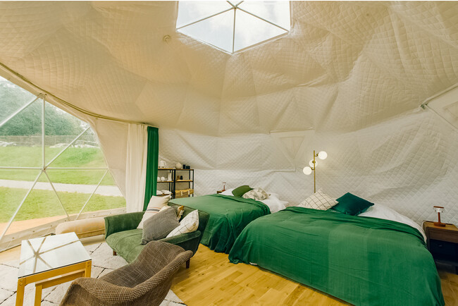2.こだわりのインテリアを配置した大空間。1棟貸切仕様。直径6Mの大型ドームテント