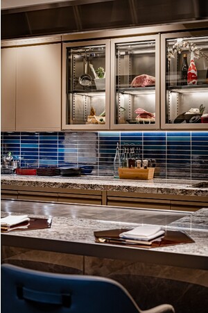 職人の技を目の前で堪能しながら、選び抜いた銘柄牛と山の幸、海の幸を楽しめる鉄板焼「風音」(かざね)。アトリウムの中央、カフェ&バー「リュトモス」とイタリアングリル「メロディア」の奥に位置し、リズム、メロディ、ハーモニーの3つの要素が融合した美しい音楽に、鉄板の上で食材を焼く音や立ちのぼる香りが風格を加えます。歌舞伎の下座音楽にもある「風音」(かざおと)をヒントに、音色のバリエーションや変化を、歌舞伎や雅楽の伝統的な舞台構成である「序破急」と捉え、3 種類の鉄板焼のコース料理をご用意しています。カウンター越しにシェフとの会話を楽しむ贅沢な空間です。