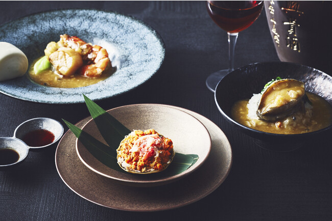 コースは上海蟹を代表するお料理、姿蒸しから。食べやすく身をほぐした筋肉質の繊維が食べごたえ抜群の蒸し上海蟹に、朱色に輝く内子や口どけなめらかな味噌をたっぷり添えて。味わいの異なるオスとメスを一度に頬張れる、ベーシックにしてもっとも上海蟹を謳歌していただける逸品です。