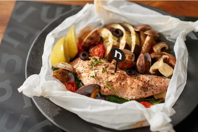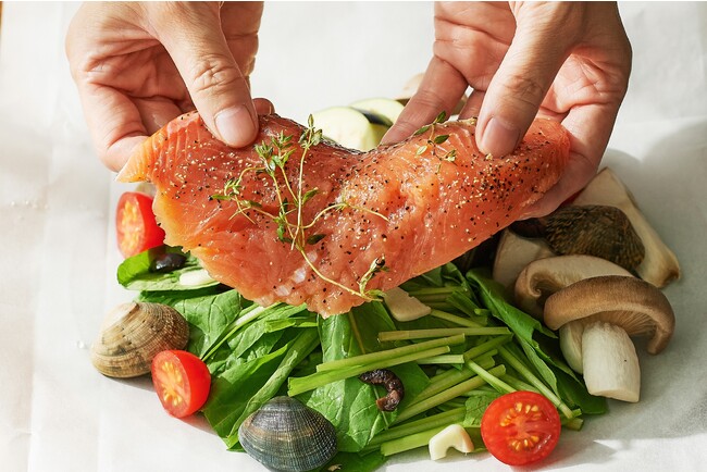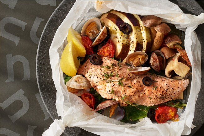 1. お皿の上にクッキングペーパーを置き、京野菜を彩りよく乗せ、軽く塩・胡椒した魚の切り身とあさりを乗せる。