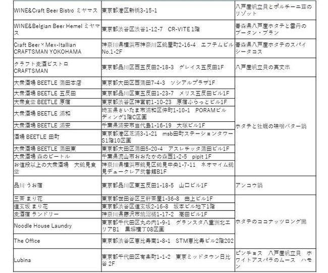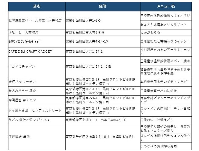 「三陸・常磐 うみうまフェア」第一弾 提供飲食店・メニュー一覧(東京・首都圏エリア)