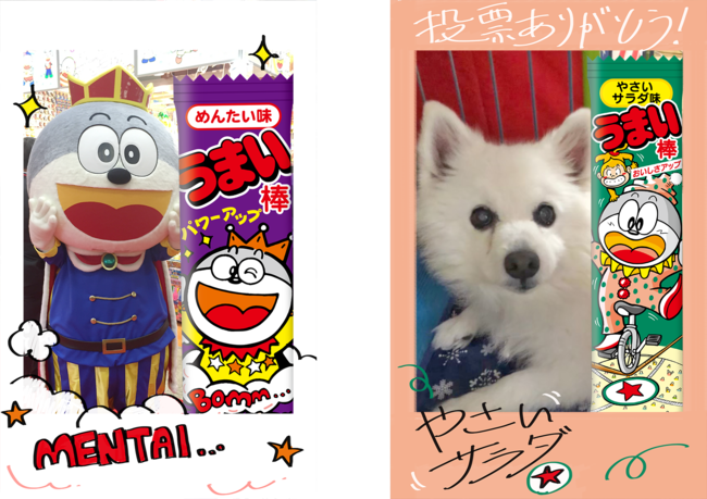 また、うまい棒のパッケージにいるキャラクター「うまえもん」が調査員の「出口調査(アンケート)」に応えると、さらにその場で結果がわかる(インスタントウィン)Wチャンスプレゼントキャンペーン(※PC版では正常に動作しない場合がございます。スマートフォンでお楽しみください。)に参加ができます。